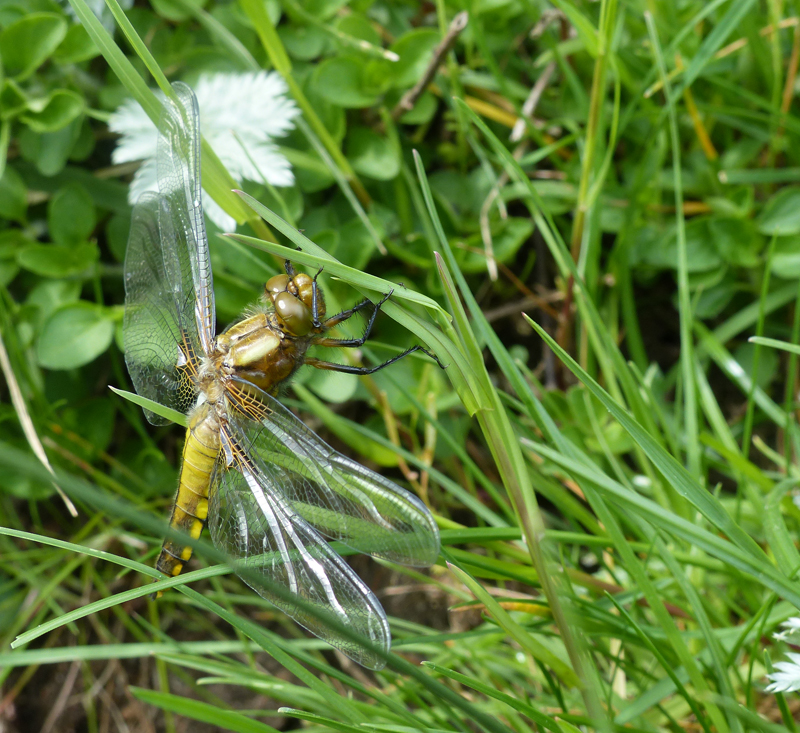 Nous confondons souvent libellules et demoiselles. Les libellules ont toujours les ailes à plat au repos. Les demoiselles ont un corps plus fin et leurs ailes sont jointes au-dessus du corps au repos.